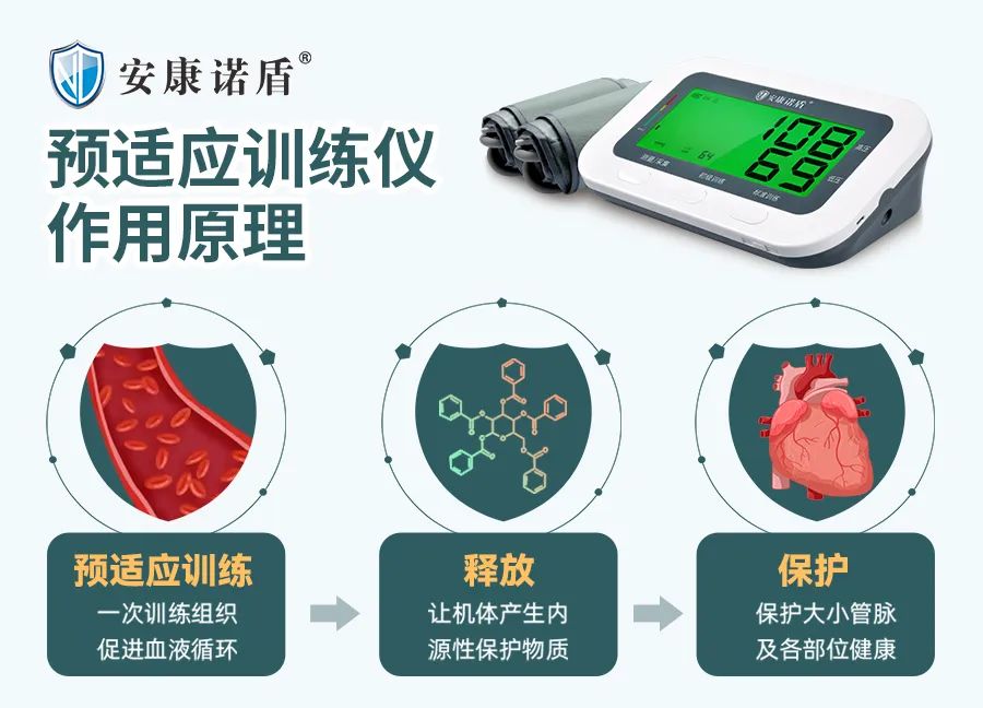 而安康諾盾缺血預(yù)適應(yīng)訓(xùn)練儀可通過經(jīng)常對人體進(jìn)行反復(fù)的、短暫的、無創(chuàng)傷、無危害的缺血預(yù)適應(yīng)訓(xùn)練,激發(fā)人體免疫系統(tǒng)的應(yīng)急機制,從而達(dá)到預(yù)防心腦血管等疾病的發(fā)生。